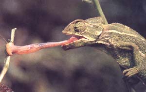 Pour chasser les insectes, les caméléons utilisent leur langue. Celle-ci est « rangée » dans la bouche et est composée de puissants muscles.