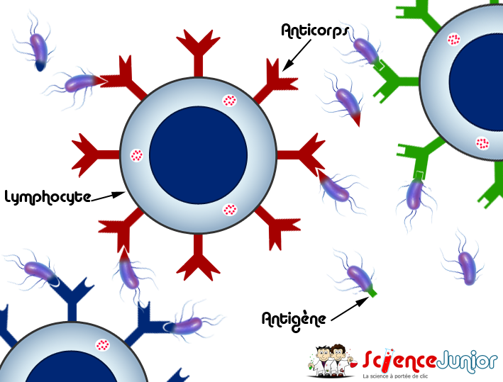 Les antigènes sont reconnus par des lymphocytes qui vont produire dans le sang des anticorps. Les anticorps vont reconnaitre les antigènes des micro-organismes afin de faciliter leur élimination et leur destruction.