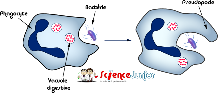 Dans un premier temps, le phagocyte s’accole à la bactérie puis il se déforme et émet des pseudopodes. Les pseudopodes sont des sortes de petits bras qui vont entourer la bactérie. Le phagocyte absorbe la bactérie et la digère. Une fois la première bactérie digérée, il peut en phagocyter une autre. Au bout d’un certain nombre de phagocytoses, la cellule meurt.