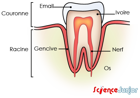 La partie visible de la dent est appelée la couronne et la partie insérée dans la gencive et l’os la racine.