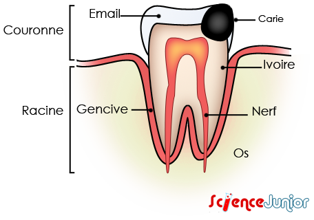 Une dent est recouverte d’une partie blanche et solide que l’on appelle l’émail. C’est cette partie que l’on brosse. En dessous, on trouve l’ivoire. A l’intérieur de la dent, il y a un nerf. C’est lui que l’on sent et qui fait mal lorsque la dent est cariée !