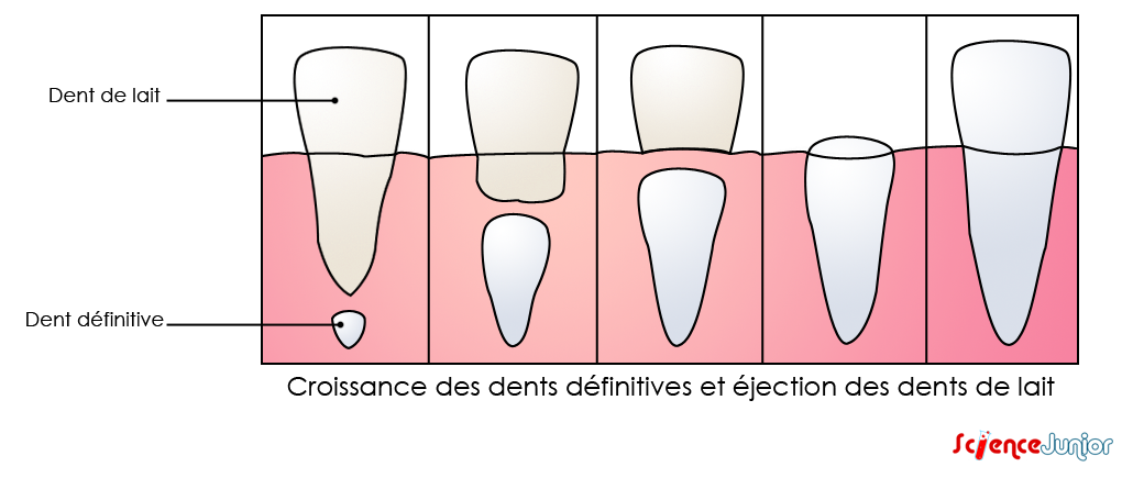 Les dents de lait avant de tomber régressent petit à petit. Voici un schéma pour t’aider à mieux comprendre ce qu’il se passe :