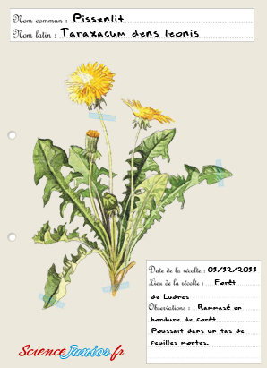 Le nom s’écrit généralement en langage commun, puis en nom latin. Le nom commun est celui par lequel on nomme la plante habituellement, par exemple, « pissenlit ». Lorsque tu as le nom commun, tu retrouves facilement le nom latin sur internet en recherchant « Nom latin pissenlit » dans Google. Ce qui donne pour le pissenlit : Taraxacum dens leonis.