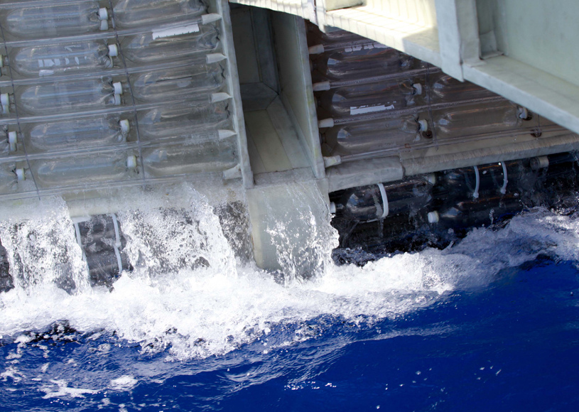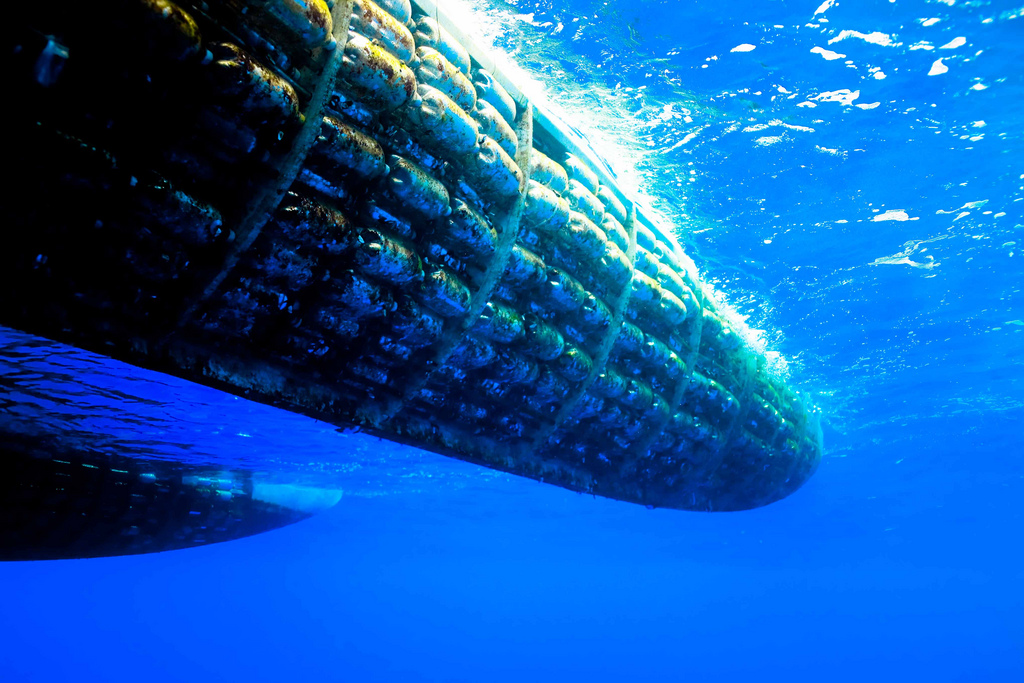 Dans une structure en plastique recyclable et en colle écologique à base de noix de cajou et de sucre imperméable, les créateurs ont incorporé 12 500 bouteilles en plastique usagées de 2 litres qui assurent la flottaison.