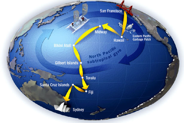 The Plastiki et tout son équipage sont partis le 20 mars dernier de San Francisco aux Etats-Unis pour une traversée de l’Océan Pacifique afin de rejoindre Sydney en Australie au mois de juin prochain.