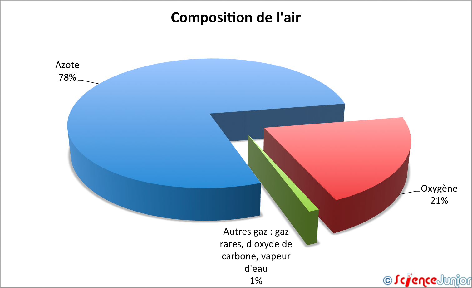 L’air est un mélange de gaz constitué à 78% par de l’azote (N2), à 21% par de l’oxygène (O2) et à 1% d’autres gaz comme le dioxyde de carbone (CO2), la vapeur d’eau (H2O) et de gaz rares.
