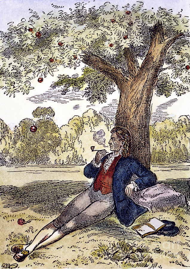 La légende dit qu’il a eu cette révélation lorsque, assis sous un pommier, une pomme lui est tombée sur la tête.